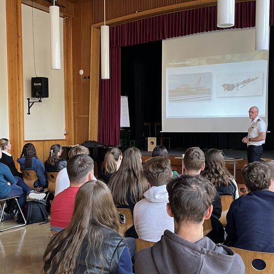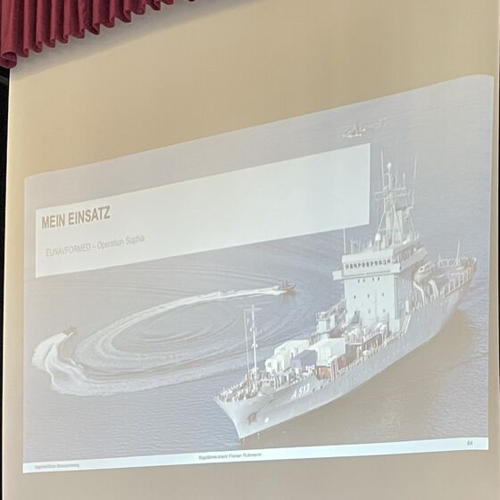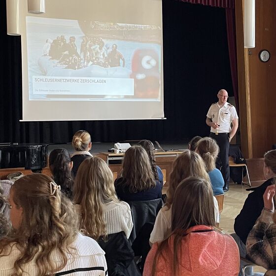 Am 20. September besuchten uns erneut die Jugendoffiziere der Bundeswehr Hauptmann Frank Blobel und Kapitänleutnant Florian Rohmann. Sie berichteten den Kursen Politik-Wirtschaft Jahrgang 13 im Rahmen des Semesterthemas „Friedenssicherung als nationale und internationale Herausforderung“ von Auslandeinsätzen der Bundeswehr. Dabei ging es ausdrücklich um die politische Bildung von Schülerinnen und Schülern im Bezug auf die deutsche Sicherheitspolitik. Zunächst gab Hauptmann Blobel einen geschichtlichen Einblick in die Entwicklung des IS im Irak und in Syrien und der darauf folgenden Ausbreitung des Terrors. Bei der Koalition im Kampf gegen den Terrorismus beteiligte sich die deutsche Bundeswehr beim Einsatz „Counter Daesh/Capacity Building Iraq“ durch die Stationierung von Tankflugzeugen in Jordanien. Hauptmann Blobel berichtete von der Zeit als Pressensprecher im deutschen Camp. Kapitänleutnant Florian Rohmann hingegen gab Einblicke in die Mission EUNAVFORMED - Operation Sophia im Mittelmeer. Dabei ging auch er zunächst auf die Bedrohungslage durch Schleusernetzwerke ein. Ziel dieser Mission war das Zerschlagen dieser Netzwerke. Seenotrettung erfolgte nur auf Grundlage des Völkerrechts. Hierbei wurden besonders Erfahrungen mit menschlichen Schicksalen und zugleich Herausforderungen für deutsche Soldaten auf See dargestellt.