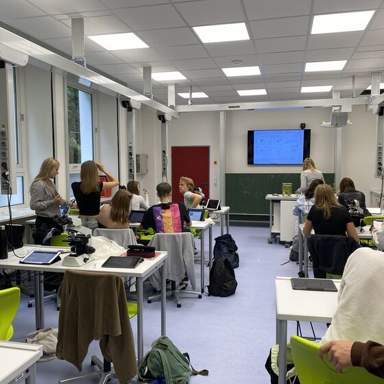 Zusätzlich zu den zwei bestehenden Unterrichtsräumen konnten die Biologinnen und Biologen zwei neu gestaltete Räume einrichten. Ein ehemaliger Vorbereitungs- und Lagerraum wurde zu einem modernen Schülerlabor umgebaut, das nun mit einem Abzug und fünf Schülerarbeitsplätzen mit Gasanschluss ausgestattet ist. Dieser Raum ist eine ideale Ergänzung zum Profilunterricht "Natur und Technik" und unterstützt die Wahlpflichtkurse der Naturwissenschaften sowie den experimentellen Unterricht der Oberstufe. Schließlich besteht seit einigen Jahren die Möglichkeit, im Fach Biologie ein experimentelles Abitur abzulegen – und dieses Labor wird ein zentraler Bestandteil dieser Ausbildung sein.