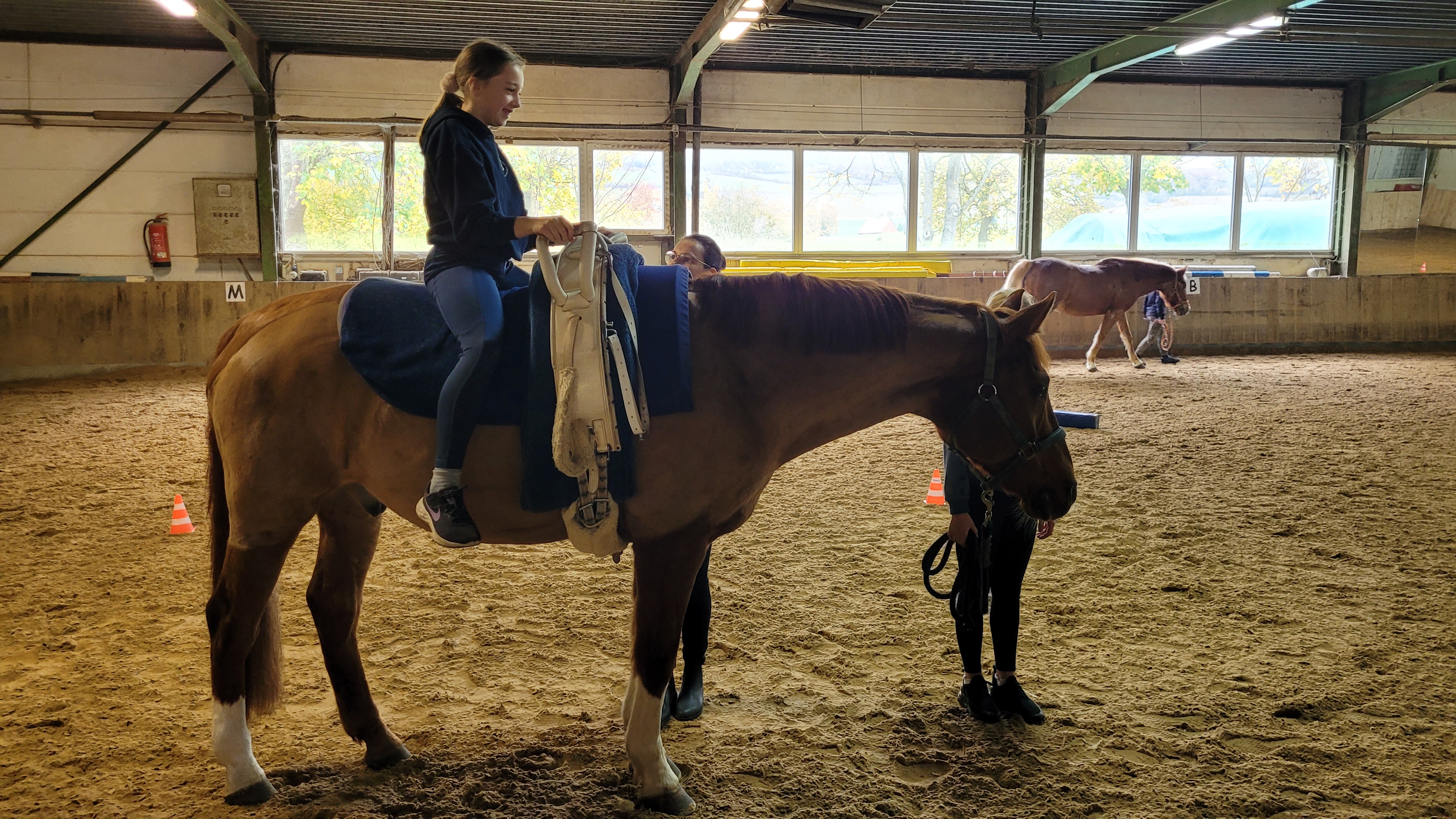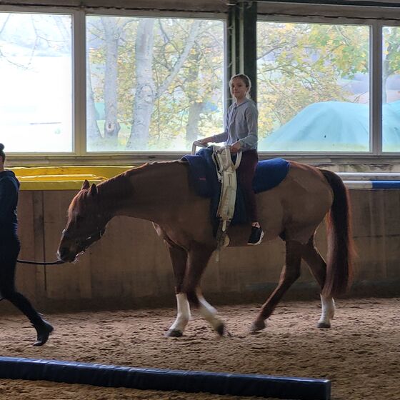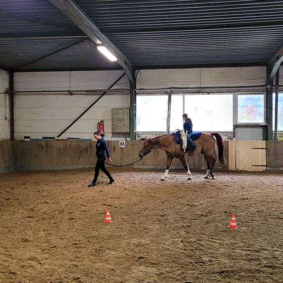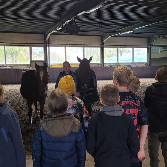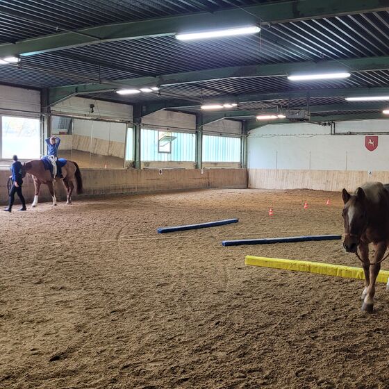 In den ersten Wochen im neuen Profil "Sport und Gesundheit" setzten sich die Schüler*innen mit ihrer eigenen Sportbiographie und ihren sportlichen Hobbies auseinander. So wurde in jede Sportart, die die Schüler*innen selbst ausüben, mal hineingeschnuppert. Am Dienstag, den 29.10.2024 stand dabei eine Sportart auf dem Programm, die man sicher so häufig in der Schule nicht auf dem Programm hat: Reiten. So besuchten die Schüler*innen die Reithalle in Hilwartshausen, um unter fachkundiger Anleitung von Frau Joppe (herzlichen Dank an dieser Stelle) erste (zumindest für die meisten Schüler*innen) Erfahrungen mit Pferden zu machen. So durften die Schüler*innen wahlweise ein Pferd führen und/ oder auf einem Pferd reiten. Dabei stand v.a. im Vordergrund der sensible Umgang mit einem Lebewesen und das Machen von sportmotorischen Erfahrungen. Jeder durfte sich selbst ausprobieren und musste nur so viel mit den Pferden interagieren, wie er/sie wollte. Am Ende durften die Schüler*innen als Highlight eine Rolle rückwärts vom Pferd machen, um athletisch und turnerisch abzusteigen. Ein tolles Erlebnis, bei denen die Schüler*innen alle sichtlich Spaß hatten.