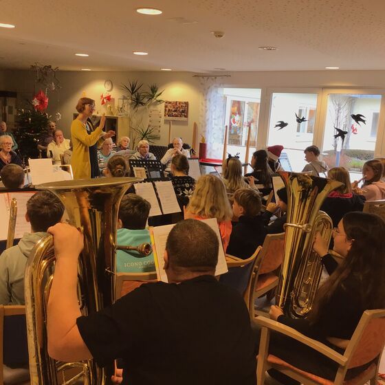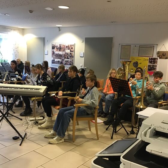 Die Bewohnerinnen und Bewohner des Seniorenhauses “Mundus” in Dassel saßen bereits auf ihren Stühlen im Mehrzweckbereich. Freude und Interesse war in ihren Gesichtern zu lesen, als die jungen Musikerinnen und Musiker der Paul-Gerhardt-Schule Dassel mit ihren Instrumenten den Raum betraten. Nun wurden Notenständer aufgebaut, Instrumente zusammengeschraubt und Stühle organisiert. Bald schon hörte man die verschiedenen Instrumente erklingen: Trompeten, eine Posaune, zwei Tuben, mehrere Querflöten, zwei Saxophone und eine Klarinette, sowie ein Cajon füllten den Raum mit ihren Klängen.
